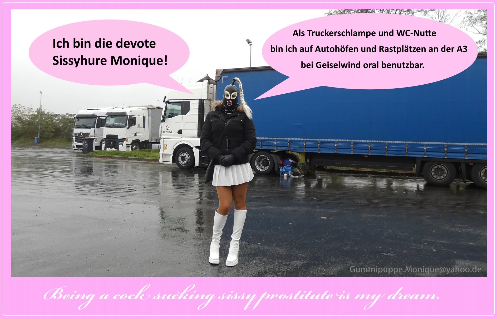 In aufreizender und extrem nuttiger Kleidung zeige ich mich auf Rastplätzen und in Industriegebieten und filme mich dabei. Ich nenne das Sissyhurentraining. Mein langfristiges Ziel ist es meine Hemmungschwelle weiter abzubauen und es als Sissyhure als selbstverständlich anzusehen fremde Schwänze zu blasen. Im Pornokino am gloryhole, als Truckerschlampe und WC-Nutte an der A3 und A73 in der Metropolregion Nürnberg.